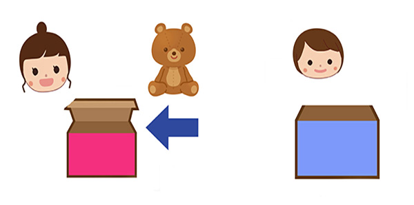 正解は明らかで、サリーがいない間にぬいぐるみが青い箱に移されているので、そのことを知らないサリーは赤い箱を開けることでしょう。ところが2歳から3歳ぐらいの子どもたちは、実際にぬいぐるみが入っている青い箱と答えることが多いのです。なぜなのでしょう?この年代の子どもたちは、自分が中心の世界に住んでおり、まだ他者の立場にたって考えることはできないといわれています。遊びも他者と関わることをせず一人でおもちゃなどを使って遊ぶ「一人遊び」であることがほとんどです。他の子が同じ部屋にいてもいっしょにそのおもちゃを使って遊ぼうとはせず、お互いに関わることなく遊び続け、逆にいっしょに遊ばせようとするとおもちゃの取りあいとなりけんかとなってしまいます。このように、自分中心であり、他者の立場に立つことなく、あくまで自分の視点から物事を見ていくので、サリーがどちらの箱を開けるのかと問われた時、サリーが知らないはずの、ぬいぐるみが入っている青い箱と答えるのです。